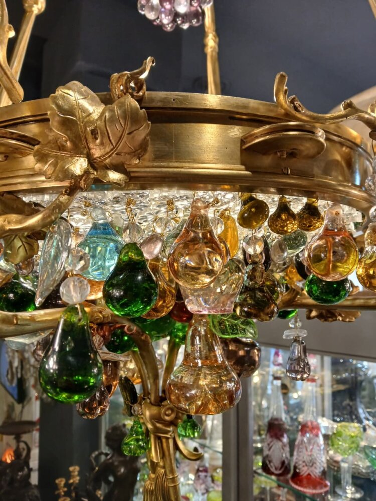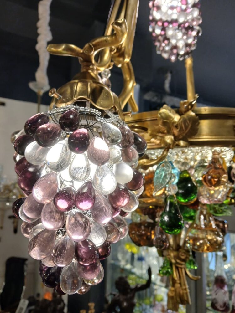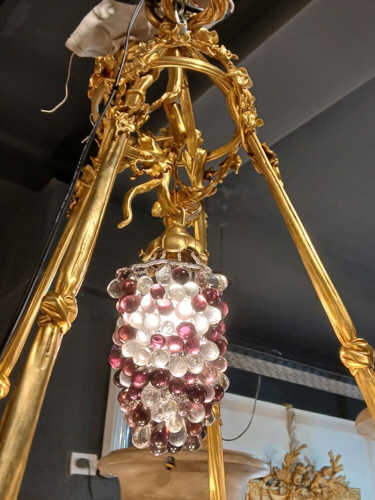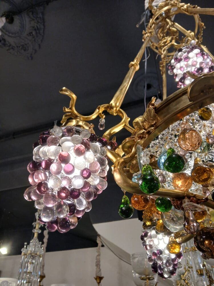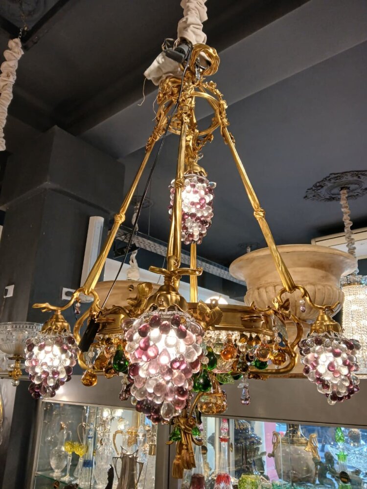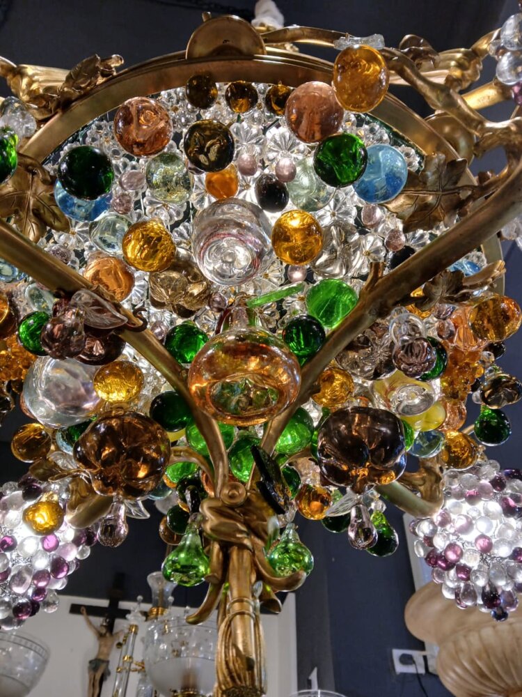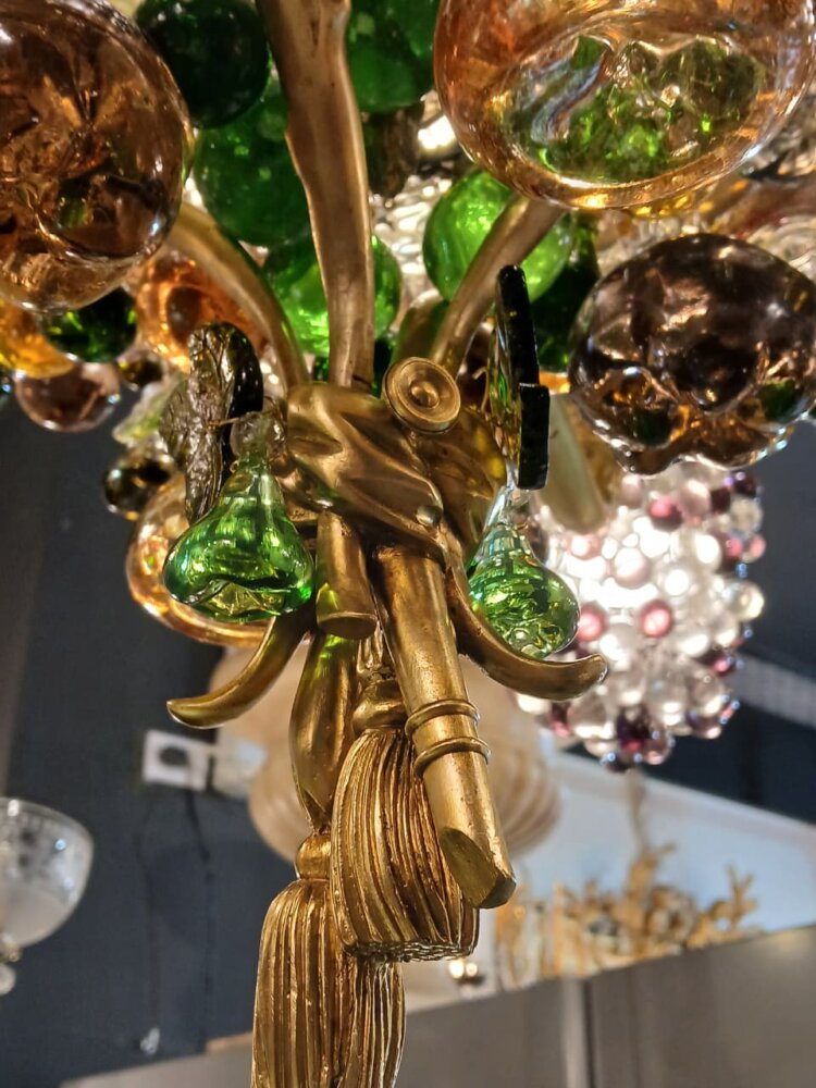 Hermosa Araña Colgante diseño italiano con frutos de murano y tulipas de uvas . Posee 8 luces. Esta realizada en bronce macizo bañado en oro ormolu . Data de los años 1920 , se encuentra en muy buen estado , electrificado a nuevo.