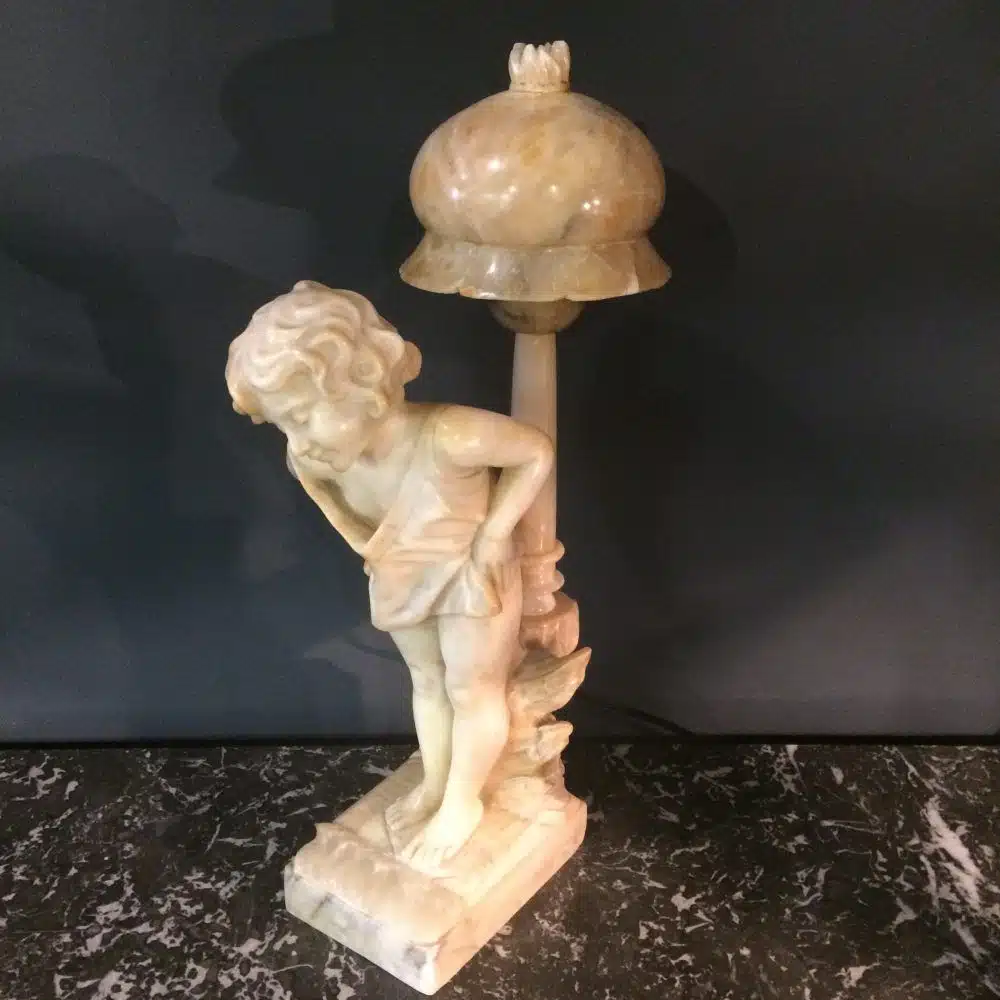 Figura Luminaria de Niño realizada en alabastro Italiano con gran calidad y diseño.Data de los años 1920 de origen frances , posee una luz con tulipa de alabastro.ALTO:50CM BASE:11.5CM X 16CM