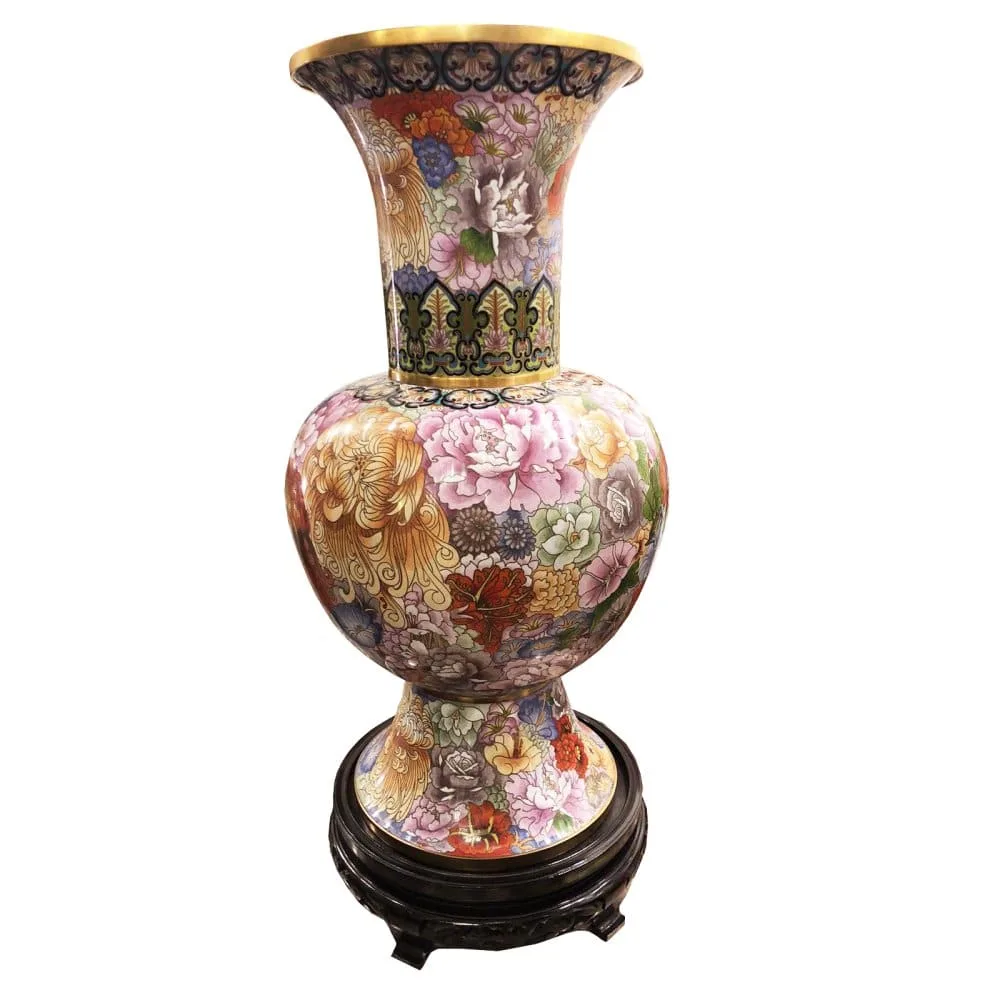 Antiguo Jarrón Florero en bronce y esmalte Cloisonne de alta calidad con un policromado pintado a mano de gran definición en su temática floral (mirar las fotos atentamente).Data de los años 1910 de origen europeo , muy decorativo. Posee una base de madera de guindo.