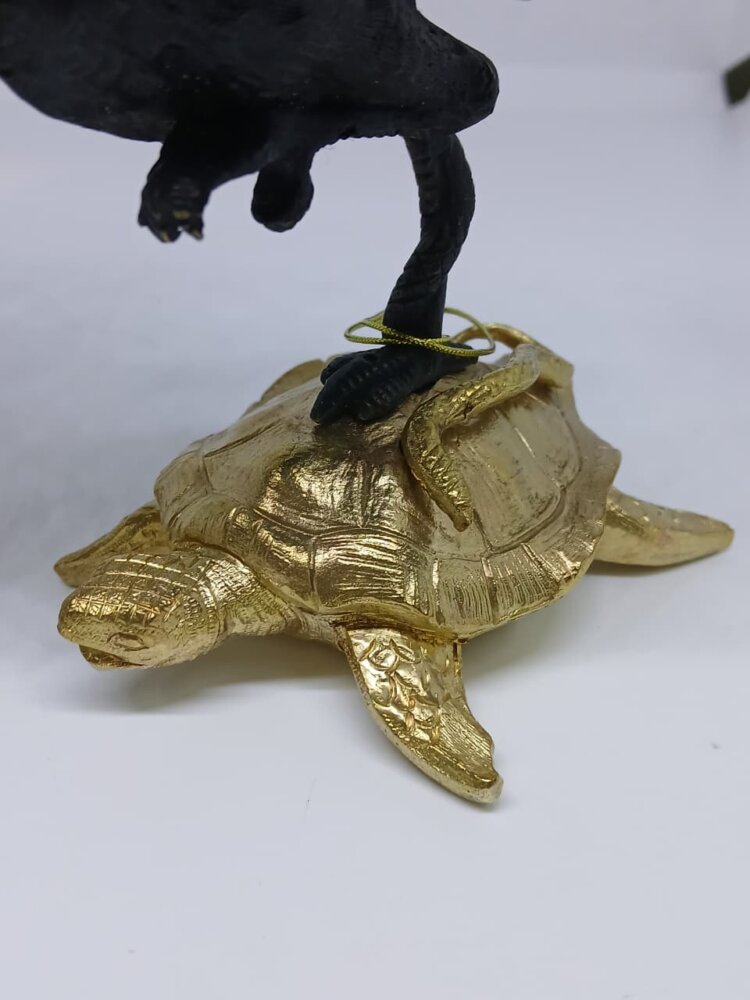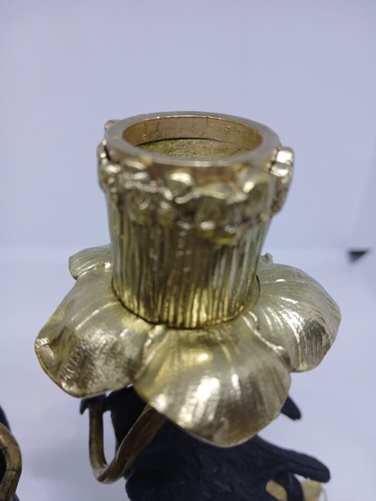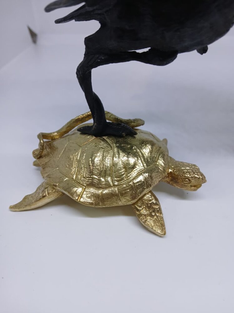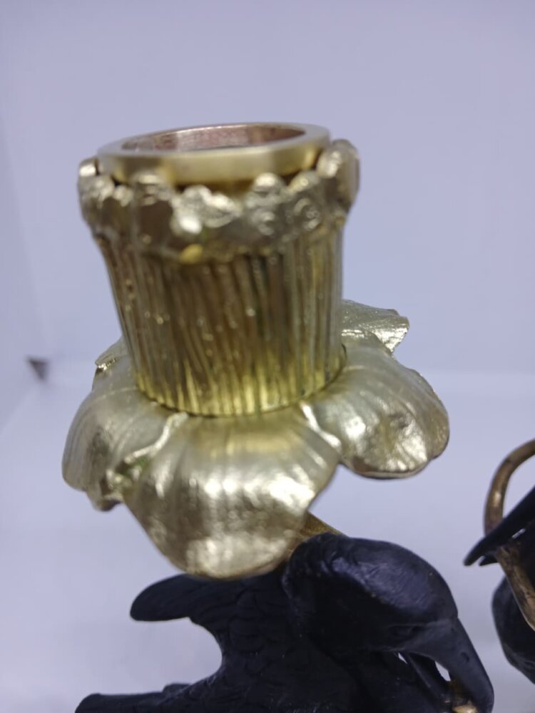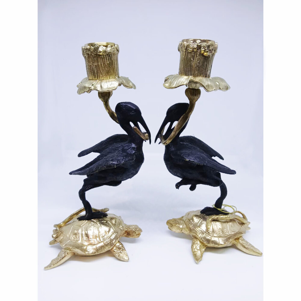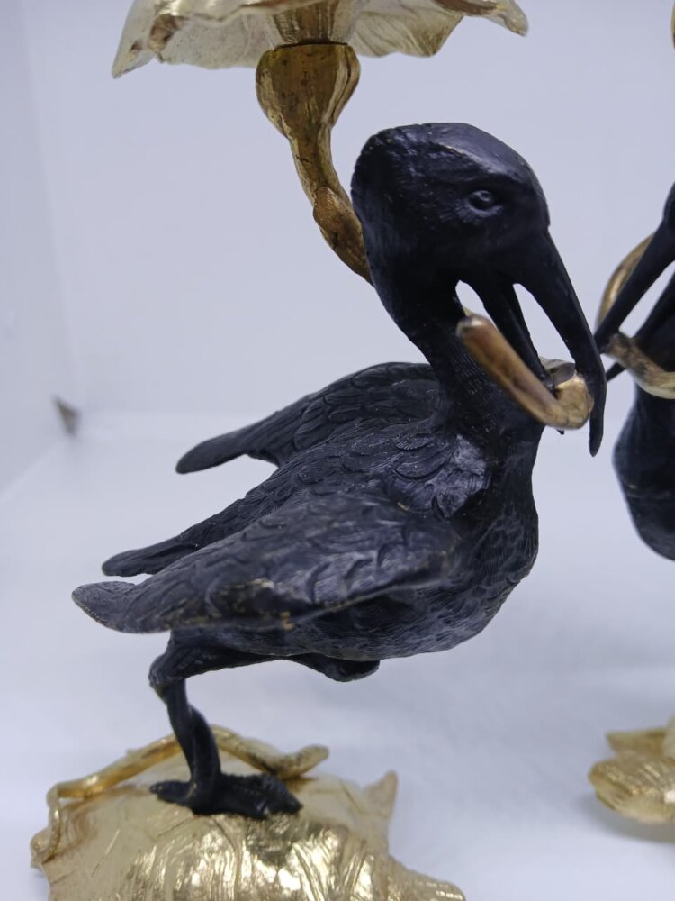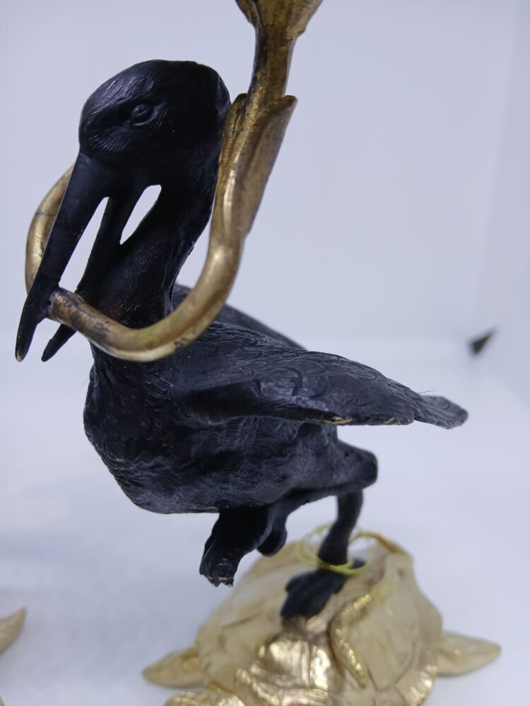 Antiguo y distinguido Par Candelabros Garzas sobre tortugas estilo Frances realizados en bronce con patina dorada y negra. Datan de los añas 1920 , se encuentran en muy buen estado listos para decorar.