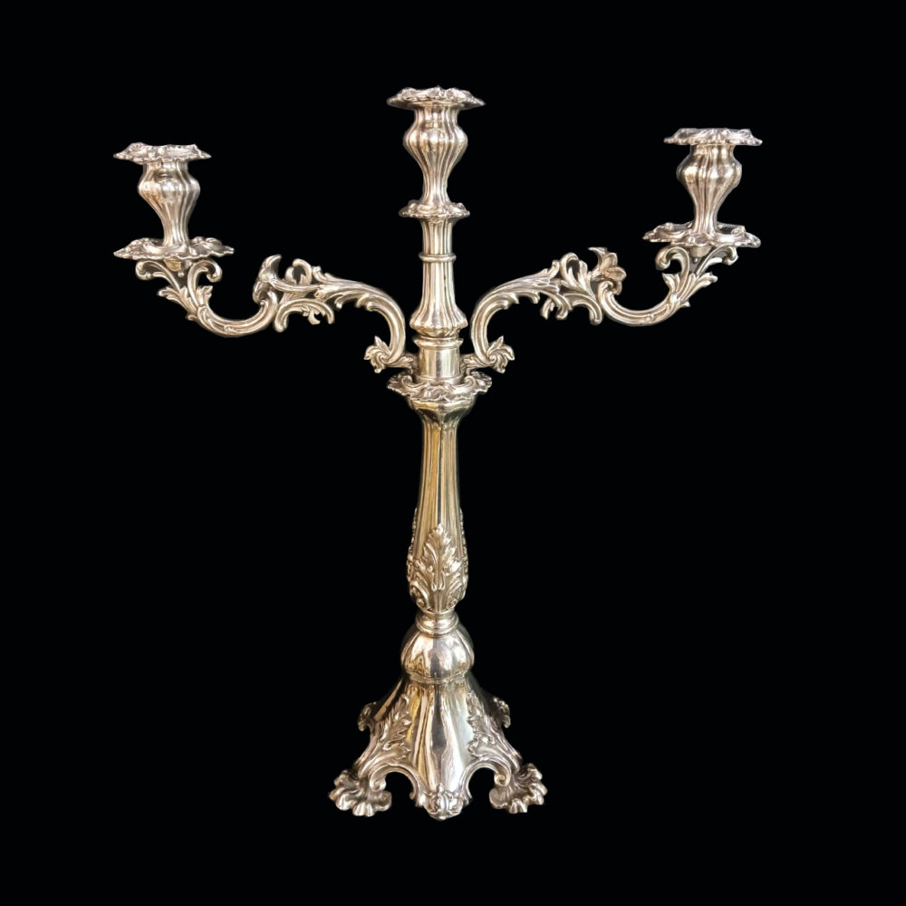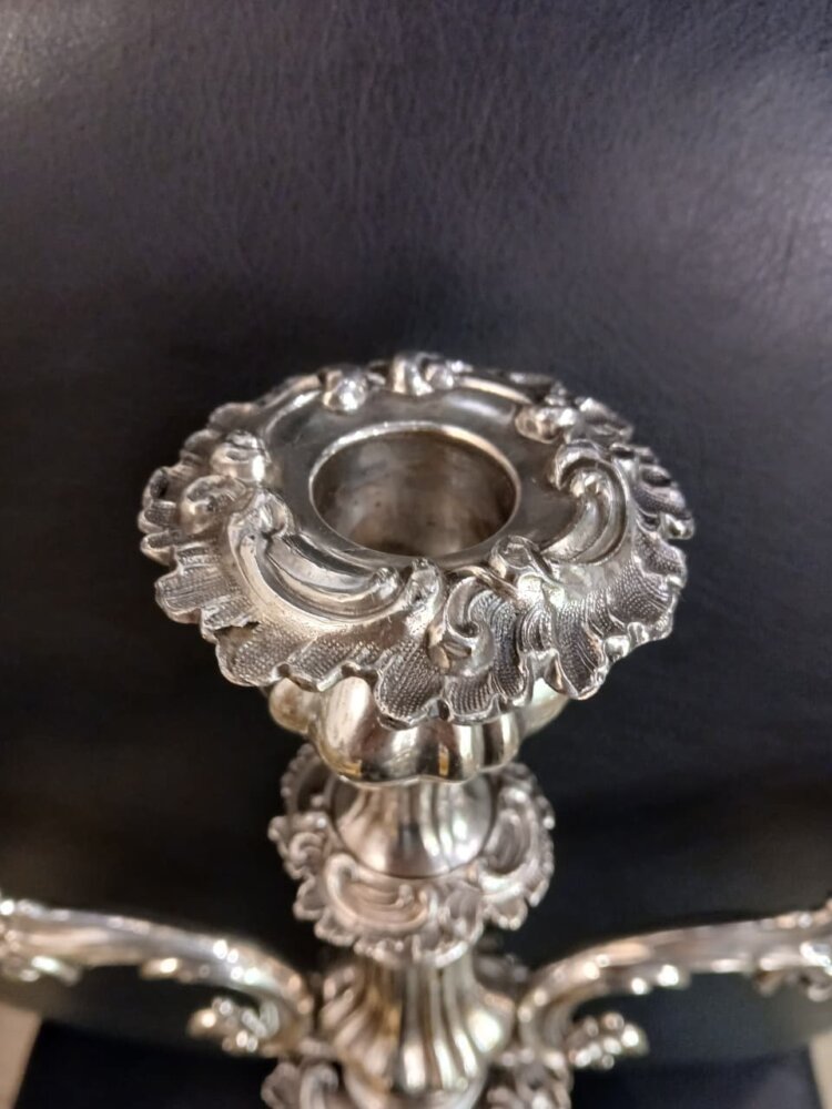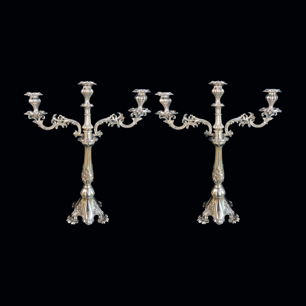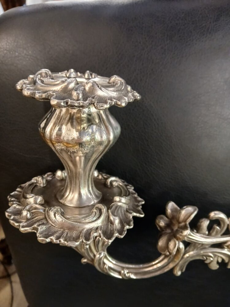 Antiguo y distinguido Par Candelabros estilo Frances realizados en metal bañados en plata. Fiel a su estilo , son muy decorativos y finos .Posee una función de desarme para armar un candelabro de 5 velas.Data de los años 1920 de origen francés se encuentran en excelente estado listo para usar.