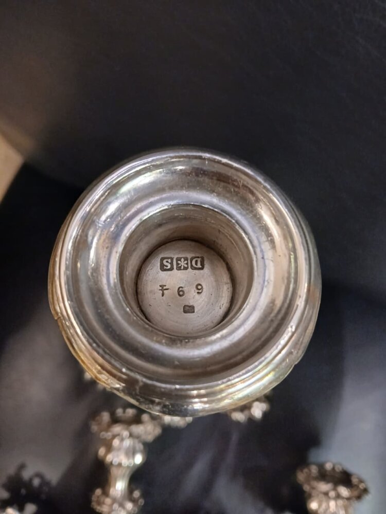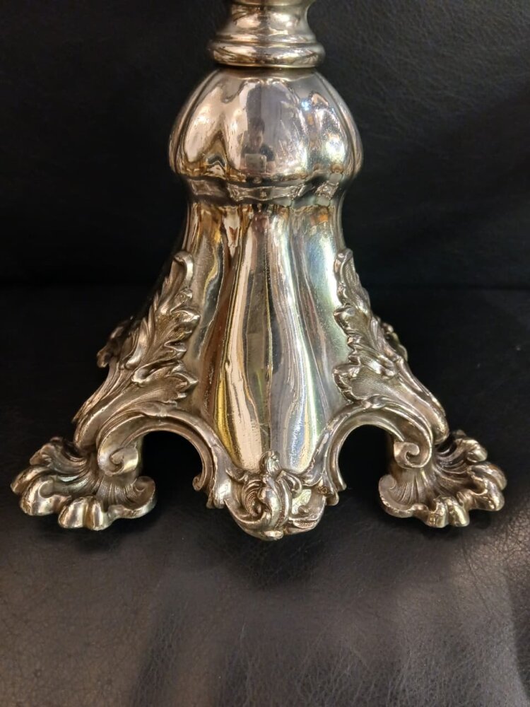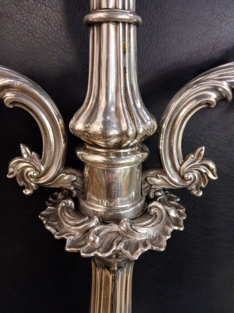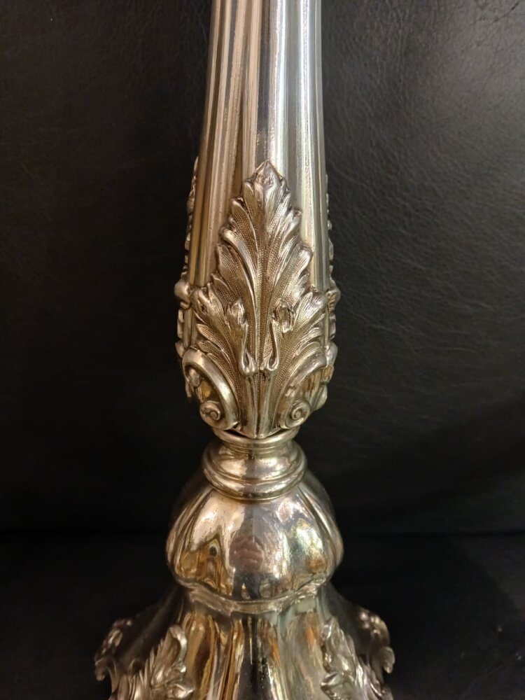 Antiguo y distinguido Par Candelabros estilo Frances realizados en metal bañados en plata. Fiel a su estilo , son muy decorativos y finos .Posee una función de desarme para armar un candelabro de 5 velas.Data de los años 1920 de origen francés se encuentran en excelente estado listo para usar.